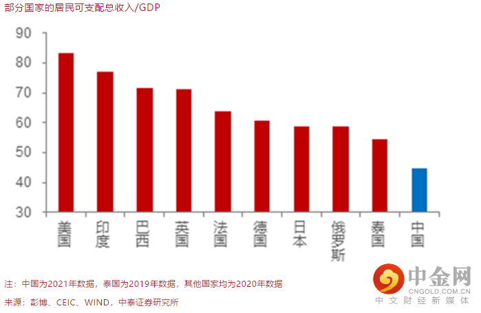 根据最新公布的《2021年国民经济和社会发展统计公报》,全年全国居民人均可支配收入35128元,比上年增长9.1%,扣除价格因素,实际增长8.1%。人均可支配收入的实际增速与GDP同步,但居民可支配收入总额占GDP的比重只有43.4%,远低于60%左右的全球平均水平,其中美国为83.4%,印度为76.9%,德国为60.7%。