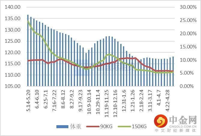 上周全国出栏平均体重118.09公斤,较前一周涨0.34%,150公斤以上出栏占比5.37%,涨0.11%;90公斤以下占比5.68%,降0.06%。目前现货价格较好,养殖户有压栏惜售意愿,出栏均重有上涨趋势,但由于天气转热对大猪需求有限,出栏体重大增可能性不大。