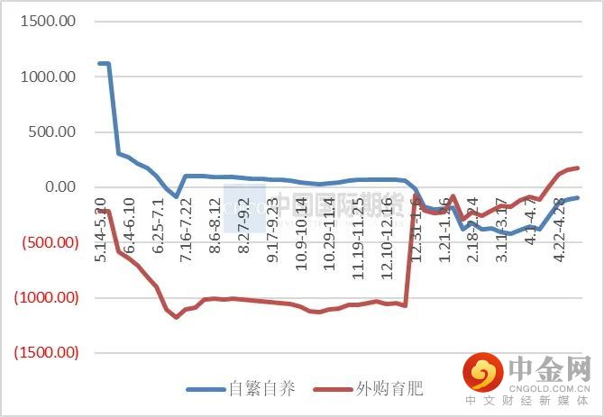 上周自繁自养亏损92.51元/头,外购育肥盈利171.23元/头。周内饲料原料玉米稳中偏强,豆粕价格小幅走低,猪价震荡调整,自繁自养周均亏损变化不大;外购仔猪盈利小幅增加,生猪出栏价格上涨速度较购买仔猪时价格上涨幅度大,盈利情况继续改善。
