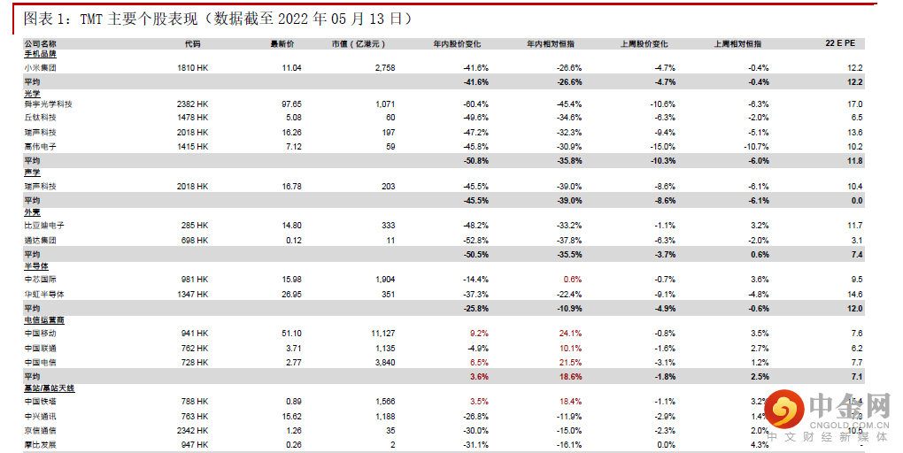 丘钛科技(1478 HK)公布4月主要产品出货量数据:公司公布4月主要产品销售数据,手机摄像头模组出货量同比及环比分别下跌21.6%及13.3%;用于车载、物联网智能终端及其他领域的摄像头模组同比及环比分别增长18.2%及22.2%;指纹识别模组同比及环比分别下跌10.5%及10.4%。我们认为4月手机相关产品数据较弱主要由于(1)手机市场需求仍然疲软;(2)疫情反复影响供应链运作,其主要生产基地的生产与出货都受到了影响。车载、物联网智能终端及其他领域的摄像头模组保持较快增长,但上述领域业务仍处发展初期,对公司的收入贡献仍然很小。