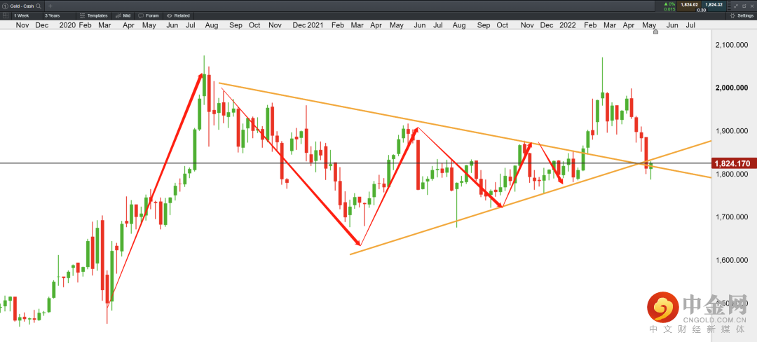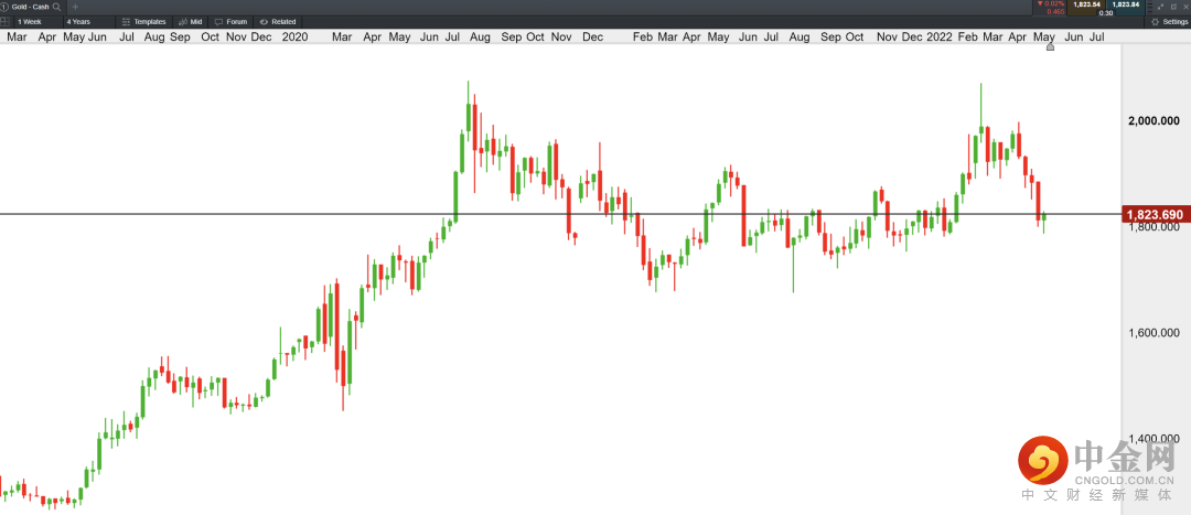 自4月18日以来,黄金在触及1998.28美元/盎司的高点后节节败退,在5月16日一度失守1800整数关口,最低跌至1786.95美元/盎司,随后价格出现反弹,收复1800关口,目前价格运行于1820附近。