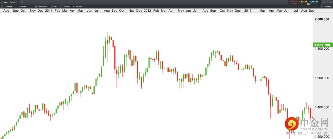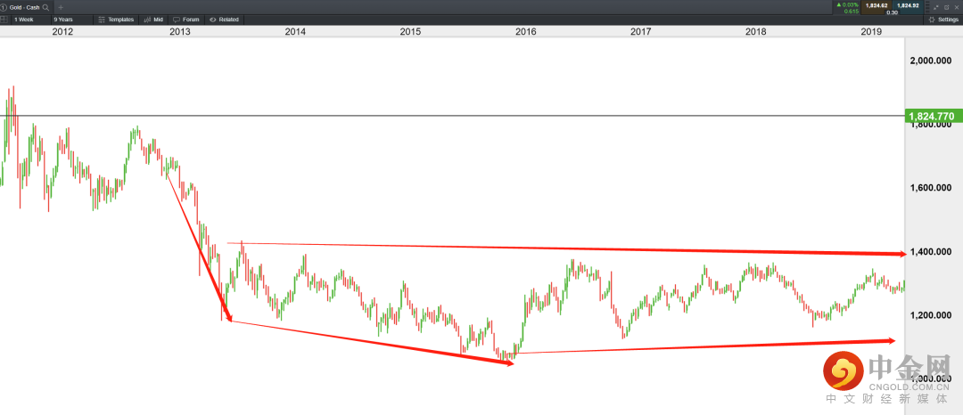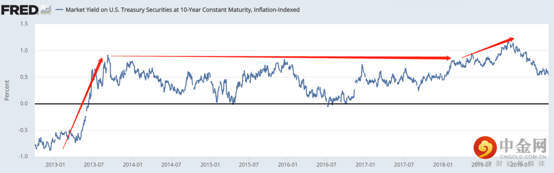 回顾上一次TIPS收益率转正的时候是在2013年,10年期TIPS收益率在2012年12月触底盘整后,在5月迎来了向上的拉升,随后在6月收益率转正。随后在接下来的5年时间处于长期的震荡走势。再来观察黄金价格,黄金价格在2012年第三季度迎来一波短暂的拉升,这主要是TIPS收益率的下跌。但在2012年第四季度高位盘整下挫。随着实际收益率的转正,黄金价格从2013年4月开始进入到了加速下跌的阶段,并最终迎来了长达5年的震荡区间。价格始终运行于1400下方。