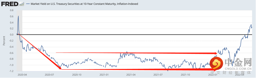 由于美联储近期开始加速紧缩,美国10年期通胀保值债券(TIPS)收益率开始转正,这是自2020年3月以来首次。而TIPS的名义收益率通常被用来衡量美国实际利率。10年期TIPS收益率的转正,意味着在计入通胀因素后,投资者在10年期美债仍然能取得正向收益。