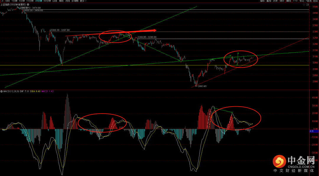 大盘继续维持强势走势,短期从三十分钟结构看已经处在末端变盘节口上,需要观察是否走出四月初的结构形态,而从周期看大概率还有三四天的周期有望出现变盘走势。假设后续的反弹压制是在3180附近,那3056将会是一个关键支撑位,届时后续行情要出现下跌回落首先需要先跌破这个位置。