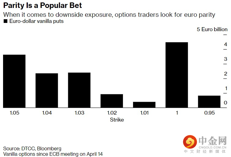 另外,据美国存托清算公司(Depository Trust & Clearing Corporation)的数据,自欧洲央行4月14日最后一次利率会议以来,已经有超过40亿美元押注欧元兑美元跌至平价。