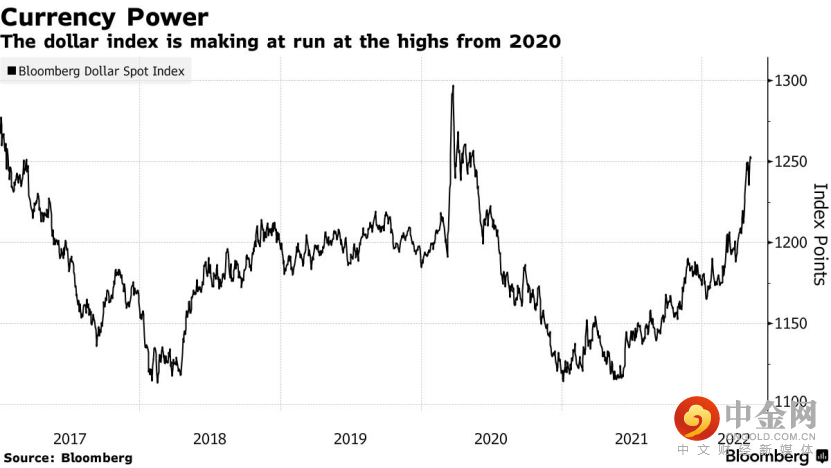分析认为,投资者对避险资产的需求、美联储的激进加息,以及俄乌战争和疫情封锁措施对全球造成的冲击,都在推动更多现金流入美元。自4月初以来,彭博美元现货指数(Bloomberg Dollar Spot Index)已飙升了5.4%,接近历史最高水平。