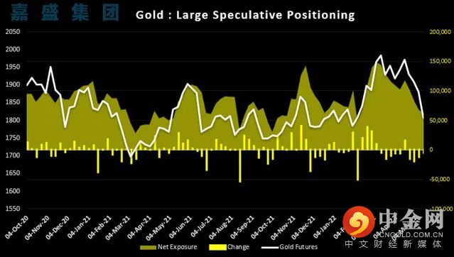 黄金价格的下跌伴随着黄金期货净多头持仓的连续第四周减少。大型投机者对黄金期货的总空头持仓升至2月底以来最高点,而且总多头降至2月中旬以来最低点。