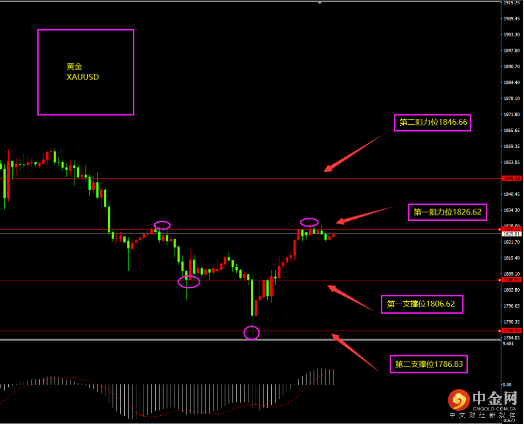 天图黄金收阳线,价格曾一度下行之后反弹,底部空头遭受多头反扑,短期价格重心仍在上移,多头仍在,日内更多以震荡以及震荡上行为主。小时图黄金自大幅下行之后,底部连续阳线产生,MACD转移至0轴之上,多头占优,短期上方无大阴线回落,空头不强,日内更多以逢低看多为主。