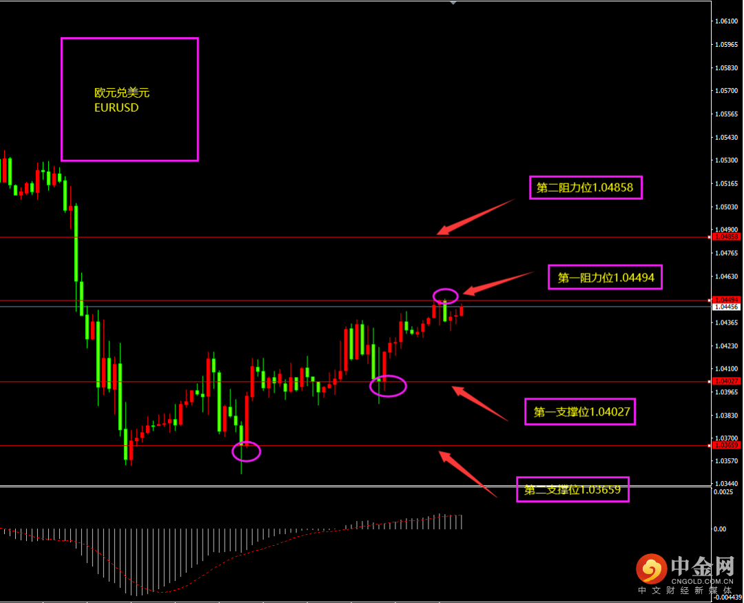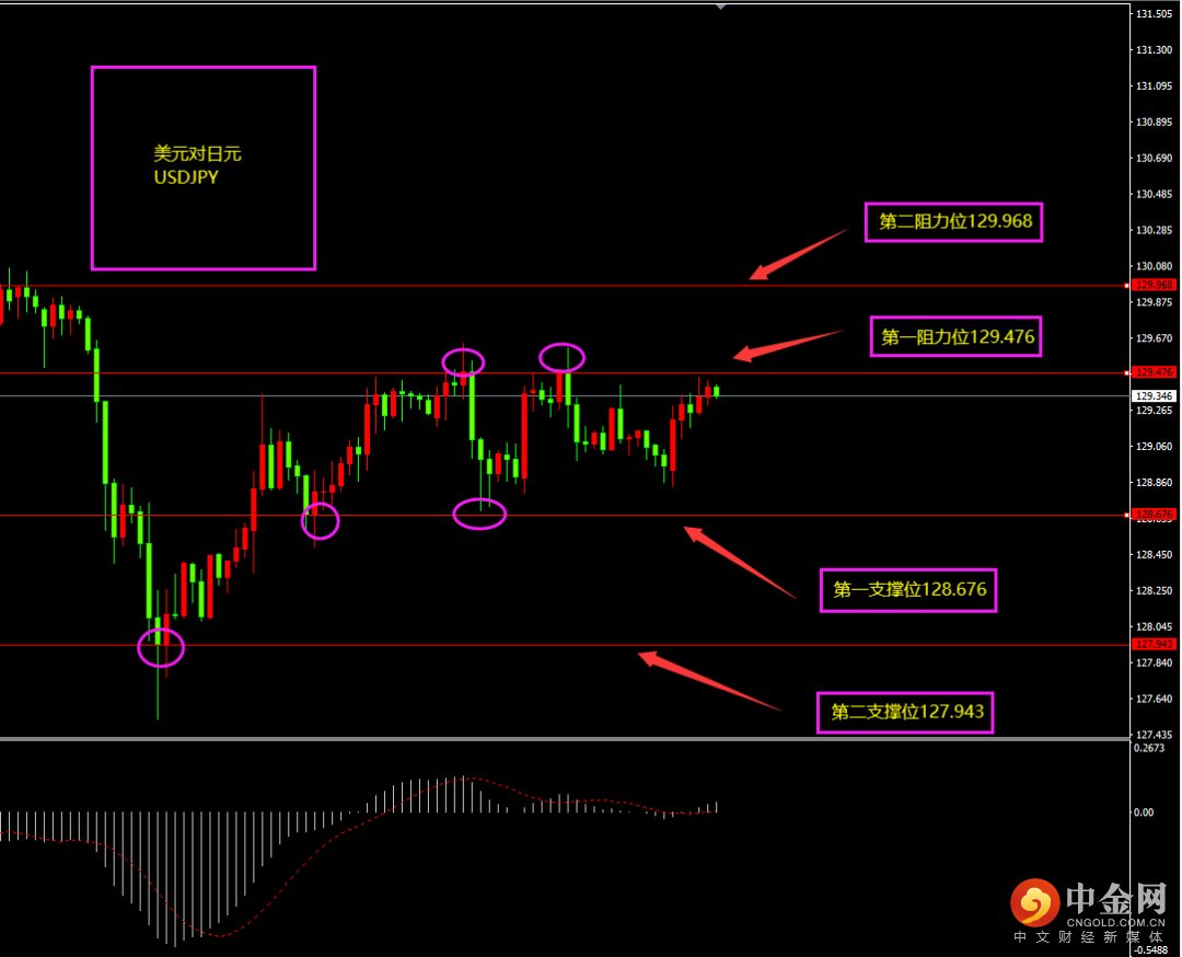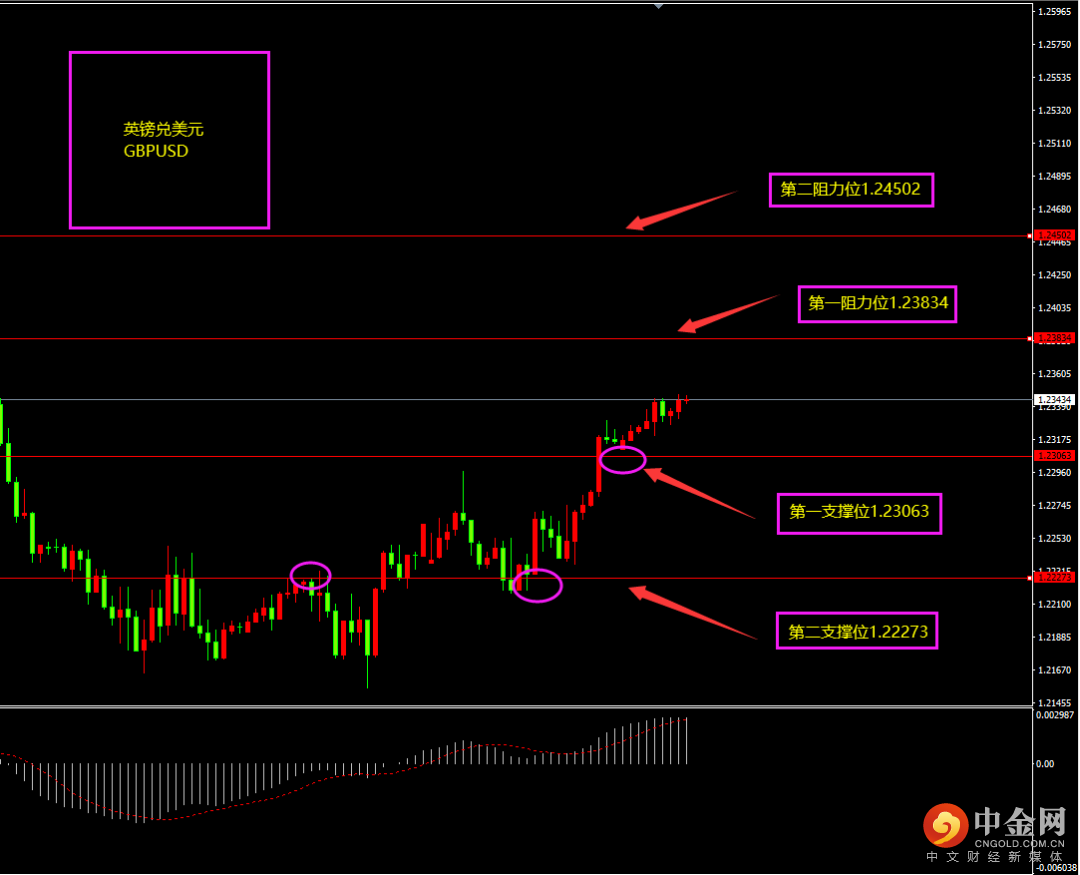 天图欧元收小阳线,价格继续冲高,多头持续增强,短期MACD逐渐上移,价格不再创新低,空头有所减弱,随着底部多头的维稳,日内更多以震荡以及震荡上行为主。小时图欧元期间连续阳线拉升,MACD转移至0轴之上,多头占优,短期上方无大阴线下滑,空头不强,日内更多以逢低看多为主。