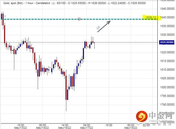 根据美国商品期货交易委员会(CFTC)仓位数据数据显示,截至5月10日当周,黄金期货净好仓盘录得67,847张合约,较对上一周5月3日当周下跌了8.6%,亦是三个月以来黄金期货净好仓盘的最低水平。这些数字反映出投资者对黄金价格短期间会受制于联储局不会放慢加息步伐的预期,因此,现货黄金价格短期间而言仍会是反复偏弱的走势,金价短线有机会在$1,839美元水平遇上障碍。