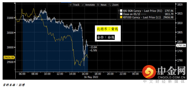 图一:5月16日午后欧洲交易时段,比特币和金价双双向下兼再一度破位,后者更创 2022 年至今新低,反映市场对世界经济火车头减速、避险准备,保持较高的警觉