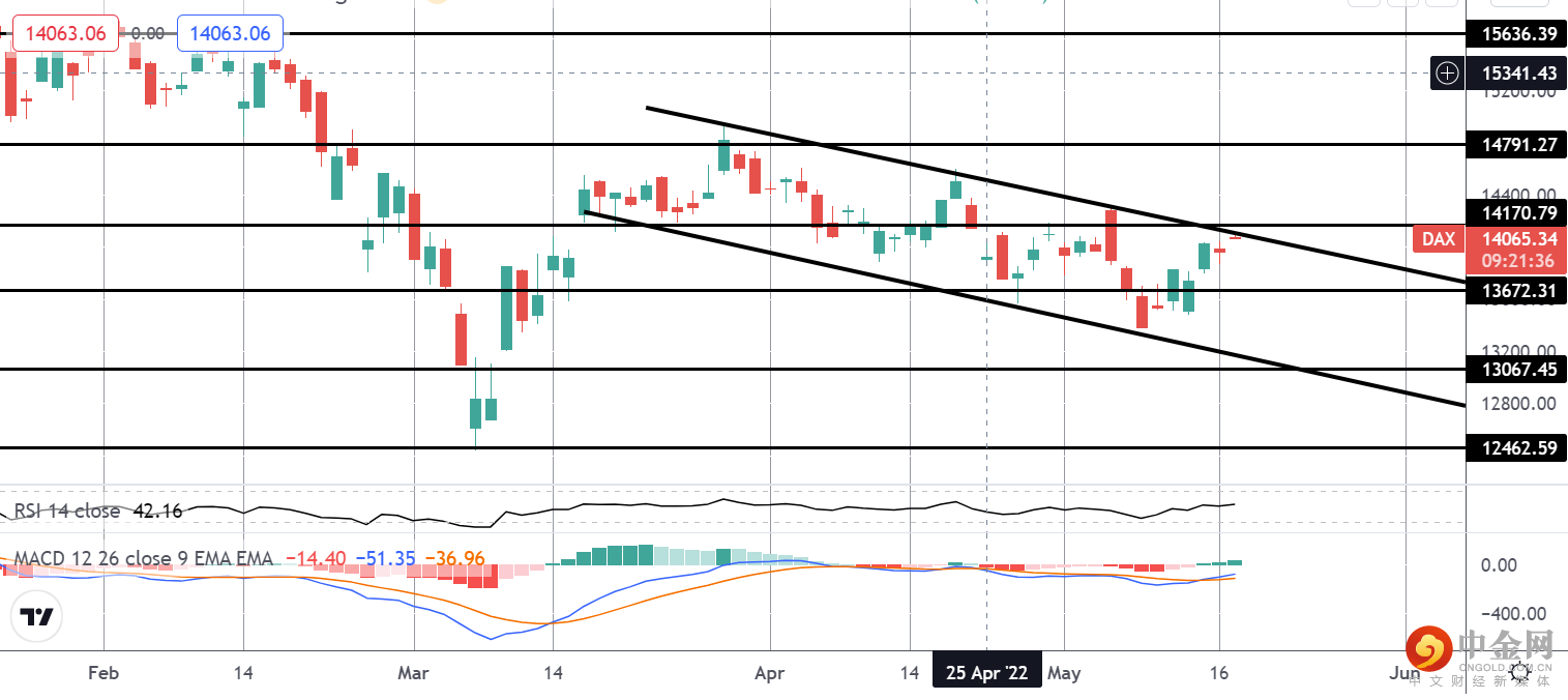 从 13672.31 水平反弹后,DAX 现在正在测试近期高点的熊通道上限以及 14170.79 阻力位。随着 MACD 和 RSI 均在此处转高,重点是突破上述水平,然后继续上探 14791.27 水平。