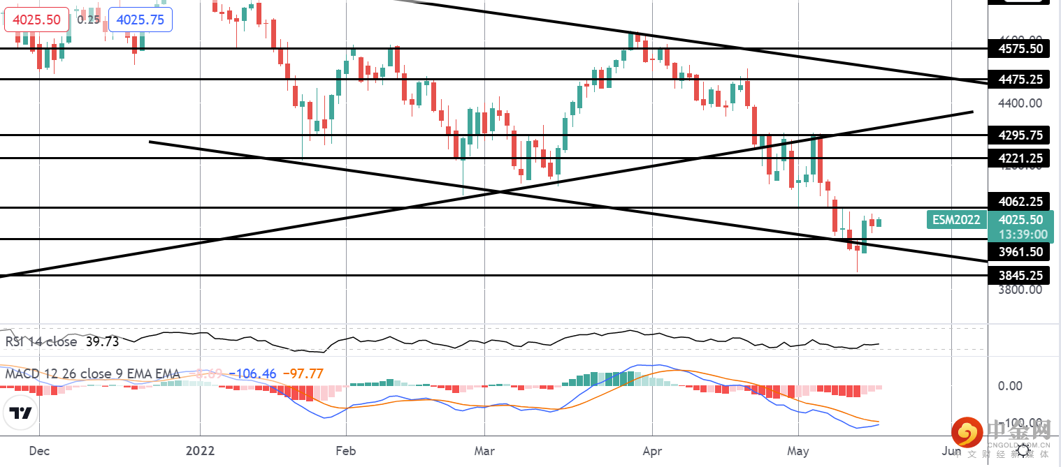 标准普尔今天从熊市通道低点反弹,在 3845.25 和 3961.50 之间找到支撑。 尽管 MACD 和 RSI 均保持负值,预示着进一步走低的风险,但如果多头今天能够回到 4062.25 上方,则仍有向 4221.25 全面回升的空间。