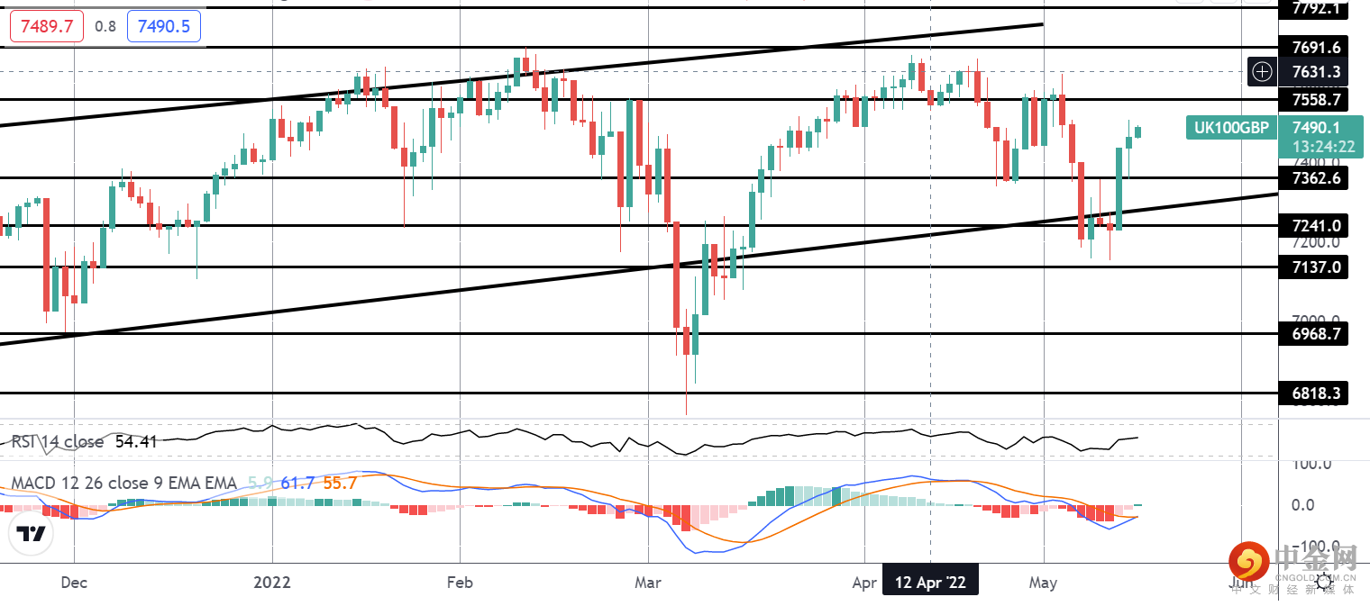 从近期跌破牛市通道的测试逆转,富时指数在最近几天强劲反弹。 价格已从 7241 支撑位飙升,目前位于通道中部,接下来接近 7558.7 阻力位。 随着 MACD 和 RSI 都转为看涨,如果我们消除局部阻力,重点是继续走高至 7691.6。