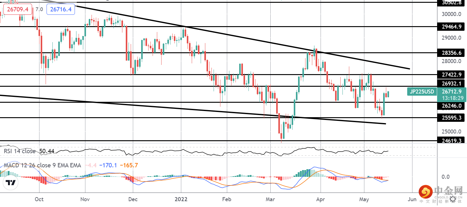 日经指数近期震荡走势继续,价格现在再次在 26246 - 27422.9 区间的中间交易。 更大的市场行动仍然由下降的楔形模式构成,这表明中期最终突破更高,将重点放在突破该区间的上限并在上方测试楔形顶部 28356.6。