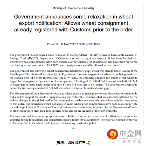 与此同时,本周二傍晚,印度商业和工业部发布公告称,将部分放松5月13日宣布的小麦出口禁令。