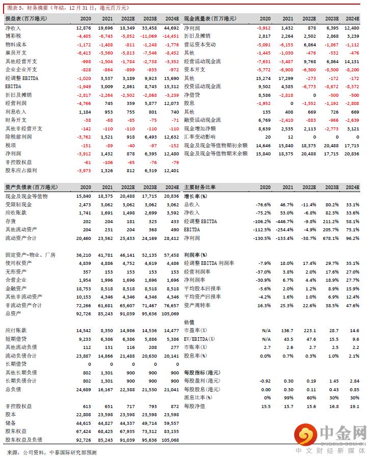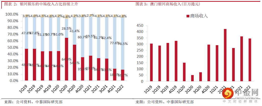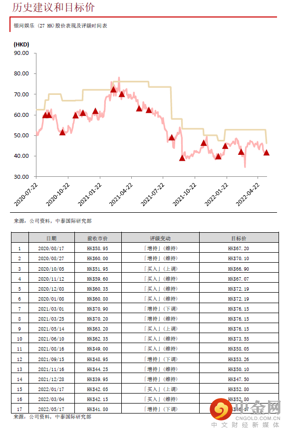 管理层指出今年五一黄金周的酒店入住率约80%左右,主要的客人来自广东省。在内地防疫限制下,预计未来几个季度博彩收入均会比较波动。管理层亦指出银河三期的建筑工程已经完成,现正观察市场状况才决定实际开业日期,我们预计可能会延迟至明年首季才开业。由于银河三四期与现有银河一二期相连,所需的额外开支较单独发展的项目少,例如省却不少宣传推广开支,规模经济效应更加明显,因此我们认为未来当博彩收入出现积极复苏,澳门银河可享受到更佳的正经营杠杆效应。