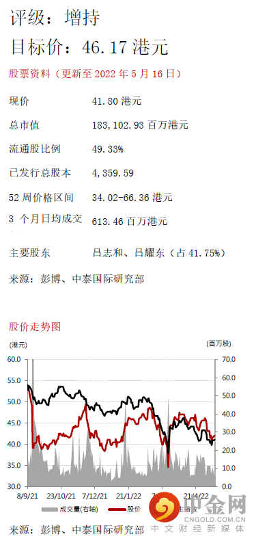 降目标价至46.17港元,给予“增持”评级