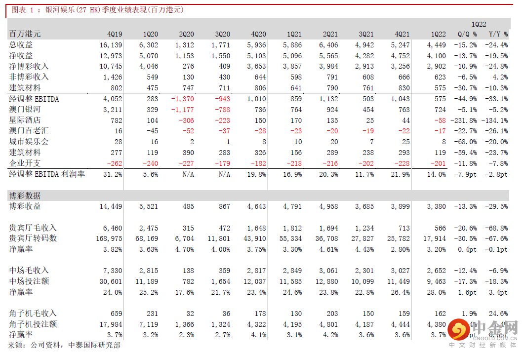 银河娱乐2022年Q1净收入为41.0亿港元(下同),同比-19.5%/环比-13.7%%;中场博彩收入同比-6.9%,跑赢行业平均(-11.4%);集团经调整EBITDA为5.8亿元(同比-33.1%/环比-44.9%),主因星际酒店关闭所有贵宾厅导致经调整物业EBITDA录得盈转亏,以及建材业务受到季节性与经济环境因素使EBITDA录得倒退。值得一提是,旗舰物业澳门银河录得7.2亿元的经调整EBITDA,同比及环比分别仅-5.2%及-5.1%,表现大幅优于主要竞争对手澳门威尼斯人,而商场零售表现是历史第二佳的季度。截至22年3月底,集团拥有净现金达到245亿港元,日均营运开支为2.3百万美元(约0.18亿港元),我们预计可在零收入的情况下营运约四年。