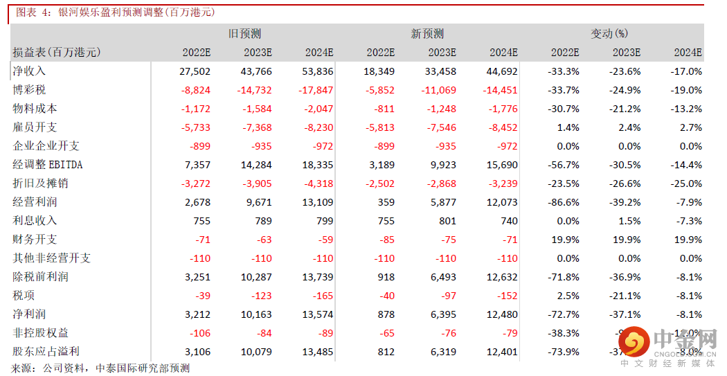 由于中央政治局会议强调对于疫情坚持外防输入、内防反弹,坚持动态清零的总方针不变,相信这些举措最终能有效控制疫情,但短期内疫情反复或导致访澳旅客量于今年难有积极的增量。我们把22-24年经调整EBITDA分别下调56.7%/30.5%/14.4%,预测22-24年经调整EBITDA分别为31.9亿/99.2亿/156.9亿港元目标价从52.8港元下调至46.17港元,对应23年17.6倍EV/EBITDA,评级从“买入”下调至“增持”。我们视银河娱乐为博彩股的首选,主因:1)拥有优秀的营运效率,经调整EBITDA恢复速度优于同业;2) 无须面对流动性紧张的压力,非常健康的资产负债表(245亿元的净现金),资产状况给予公司恢复派息的条件。料集团在最恶劣的情况仍然是最后王者。