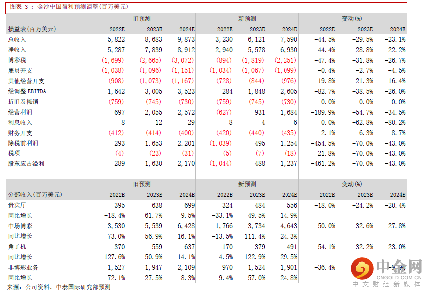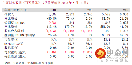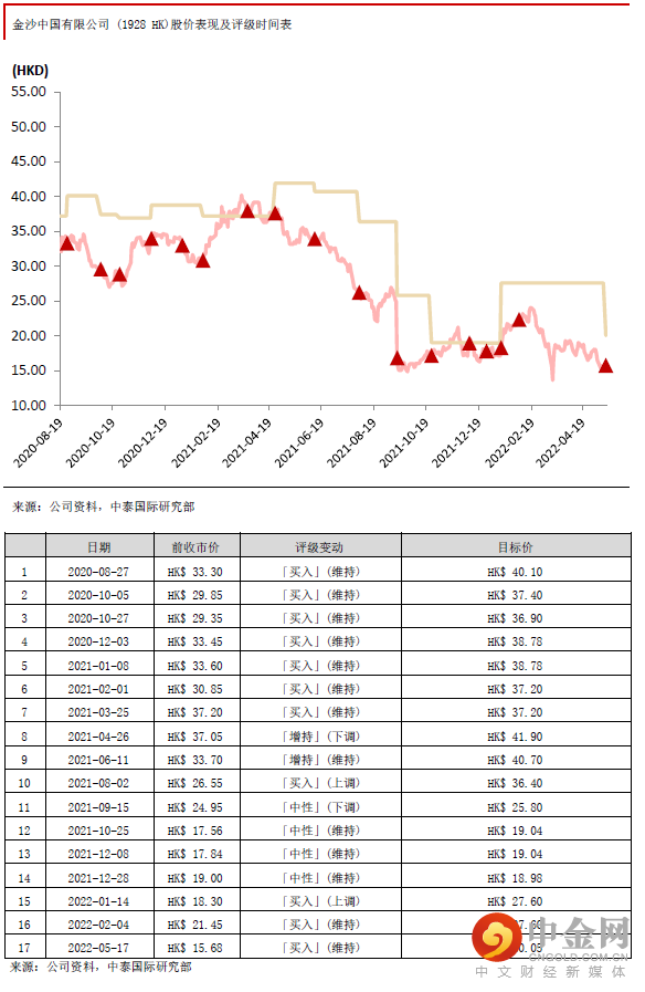 由于中央政治局会议强调对于疫情坚持外防输入、内防反弹,坚持动态清零的总方针不变,相信这些举措最终能有效控制疫情,但短期内疫情反复或导致访澳旅客量于今年难有积极的增量。我们把22-24年经调整EBITDA预测分别下调82.7%/38.5%/26.0%至2.8亿/18.5亿/26.1亿美元,同比分别亏转盈/+551.0%/+41.0%。我们把目标价从27.6港元下调至20.05港元,相当于23年15.1倍EV/EBITDA。由于潜在升幅有27.8%,因此维持“买入”评级。