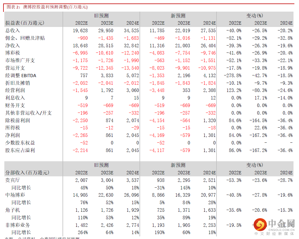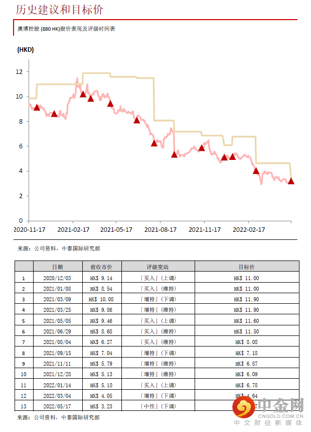 由于中央政治局会议强调对于疫情坚持外防输入、内防反弹,坚持动态清零的总方针不变,相信这些举措最终能有效控制疫情,但短期内疫情反复或导致访澳旅客量于今年难有积极的增量,上葡京可能在四季度也无法实现盈亏平衡。我们把22-24年经调整EBITDA分别下调278.8%/42.7%/18.5%,预测22-24年经调整EBITDA分别为-13.5亿/22.0亿/41.3亿港元。卫星赌场前景为澳博最主要的不明朗因素,而集团紧张的流动性仍然会对估值带来抑制,因此把目标价从4.64港元下调至3.37港元,对应23年16.0倍EV/EBITDA,评级从“增持”下调至“中性”。