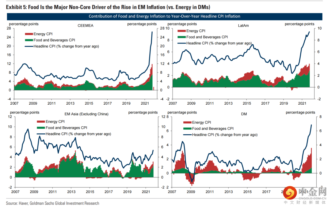 亚洲新兴市场(除中国)粮价上涨影响程度是能源涨价影响程度的2.5倍,CEEMEA为1.5倍;相比之下,DMs中能源影响程度是粮食的3.5倍。