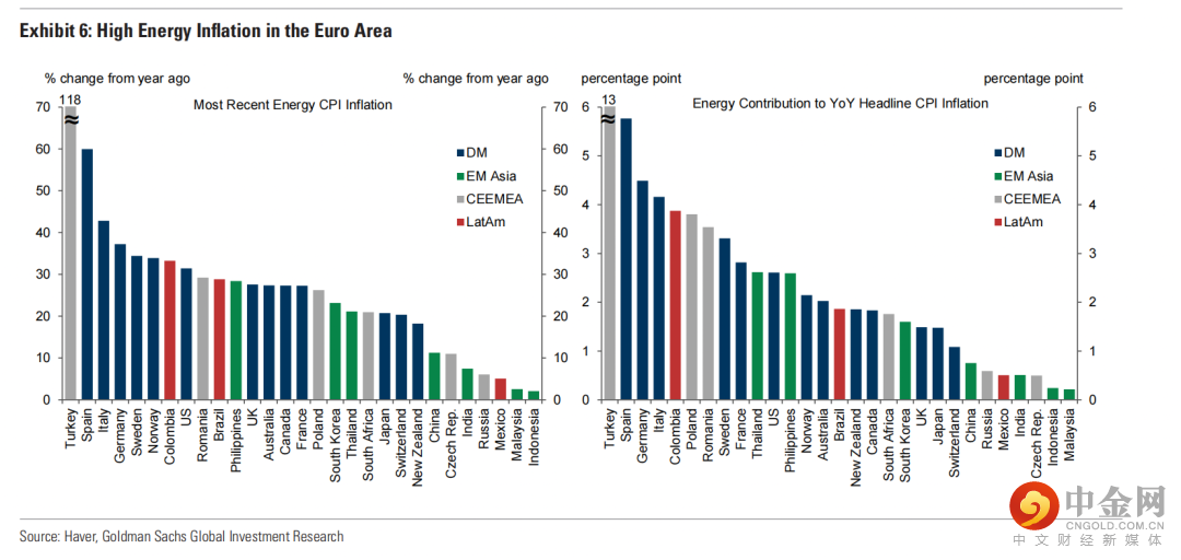 这一不同主要是由于EMs中的食品CPI权重远高于DMs。此外,能源补贴较高限制几个主要新兴经济体的能源通胀。最后,西班牙、意大利和德国的能源通胀率尤其高。