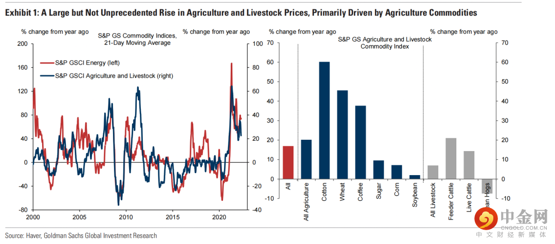 高盛指出,最近粮食价格飙升并不是空前的,比能源价格上涨更温和。由于俄乌冲突导致能源和粮食供应链中断,小麦和油籽价格上行,高盛策略师预计,未来几个月小麦价格将进一步上涨15%。