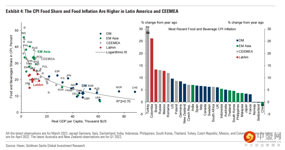 关键在于食品在CPI中占的比重不同,CEEMEA和拉丁美洲的低收入国家的食品占CPI的比重远高于DMs。具体来看,亚洲新兴市场为34%,CEEMEA为30%,拉丁美洲占20%,DMs仅为12%。