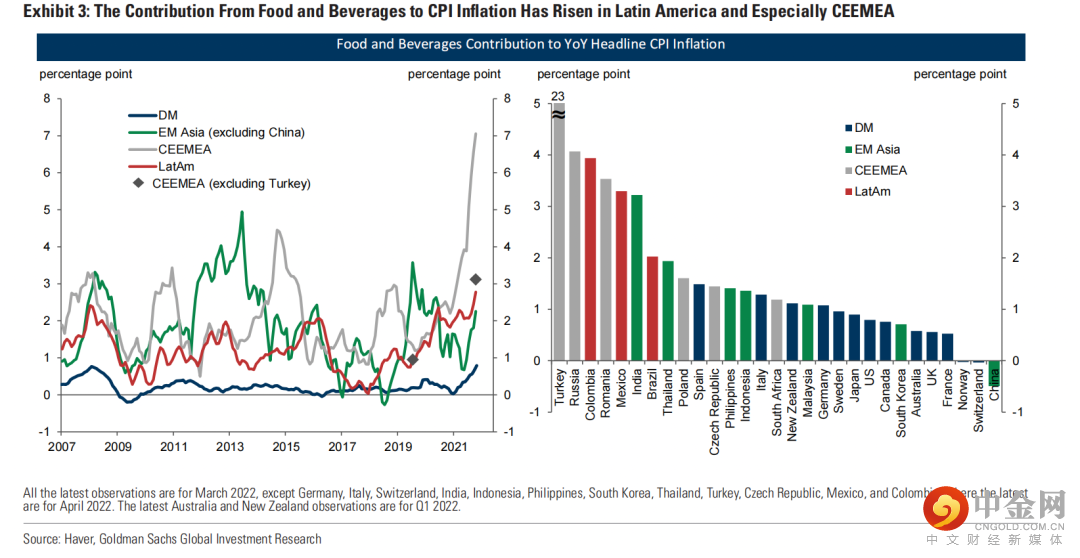 食品和饮料价格上涨对总体通胀CPI贡献最大的是中欧和东欧、中东和非洲CEEMEA(7.1pp),其次是拉丁美洲(2.8pp),紧跟其后的是亚洲新兴经济体EMs(2.3pp,不包括中国),再是发达经济体DMs(0.8pp),最后是中国(0.5pp)。