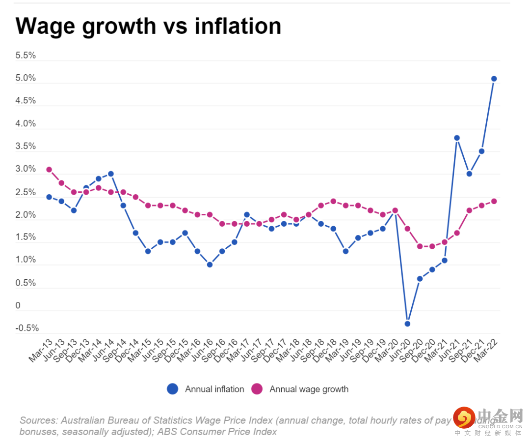 5月18日,据澳大利亚统计局数据显示,经季节调整的工资价格指数(WPI)较去年第四季度上涨0.7%,同比上涨2.4%。WPI的增幅是三年多来最大的,但整体CPI指数为5.1%。工资增幅不及通胀率的一半。澳大利亚影子金融部长Jims Chalmers在推特上写道:“澳大利亚统计局的数据证实,实际工资下降了2.7%,这是20多年来最糟糕的实际工资增长。”“在莫里森的领导下,实际工资直线下降,但人们的生活成本却在飙升。”
