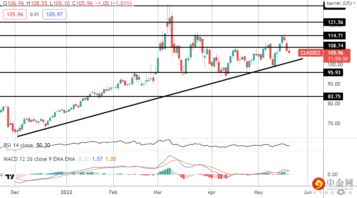 最近一次突破 114.71 水平的尝试在本周出现了进一步的抛售压力。此后原油价格从该水平反转,目前交易回落至 108.74 关口下方。然而,由于牛市趋势线仍然支撑,MACD 和 RSI 仍然看涨,但焦点是进一步推高。
