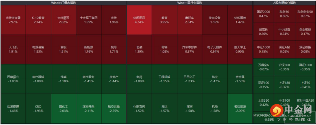 板块概念方面,光伏概念、教育概念、大飞机概念等内容涨幅居前,航空运输、煤炭开采、房地产等内容跌幅居前。