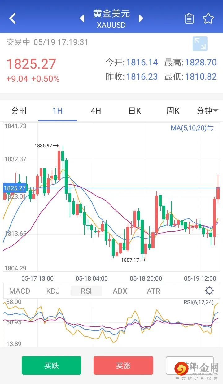 今日周四,白盘黄金整体波动区间不大,现货黄金保持稳定。欧盘时段,现货黄金短线跳涨,重返1820美元/附近上方。