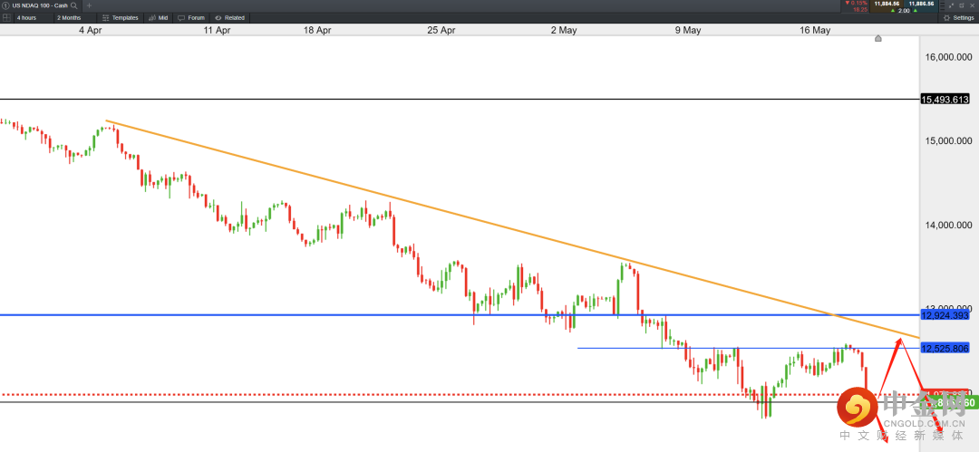 纳指再次失守12000关口,在到达周一给出的第一目标价12530后迅速转跌,回吐三日所有反弹,从目前市场情绪来看短线投机套利情绪较重,市场信心较差,因此反弹通常不可持续,从图形来看,纳指有进一步向下破位风险。4小时趋势上形成明显的震荡下行结构,目前市场在测试双底,本周需关注接下来两个交易日是否能阳包阴。