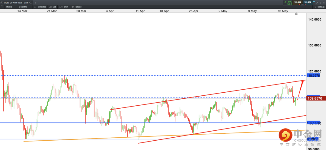 美国WTI原油周一向上突破关键阻力位110后,价格进一步延续至一周高点115.12美元/桶,虽然周二,周三均录得收阴,但属于正常回落,目前价格只需再次成功站稳110或将进一步打开上行空间。
