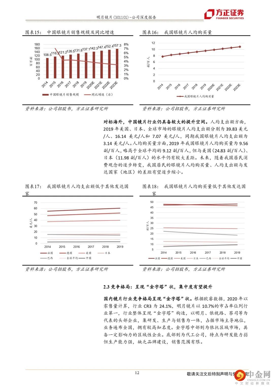 行业结构性红利待释放,国产品牌有望攫取份额。中国近视率高且呈现低龄化趋势,消费者对眼镜的需求不断升级。14-19年中国眼镜市场规模CAGR 6.5%,预计19-23年CAGR为3.2%增长至千亿元规模。对比发达国家,我国镜片人均支出额与购买量仍有较大提升空间。中国镜片市场竞争格局呈现金字塔结构,顶部为头部企业,中部为区域性企业,底部为代工企业。20年按零售量计CR3为24.1%,其中明月以10.7%位列第一。受益于国货崛起,以及综合实力较弱的企业退出,国产龙头品牌有望攫取市场份额。