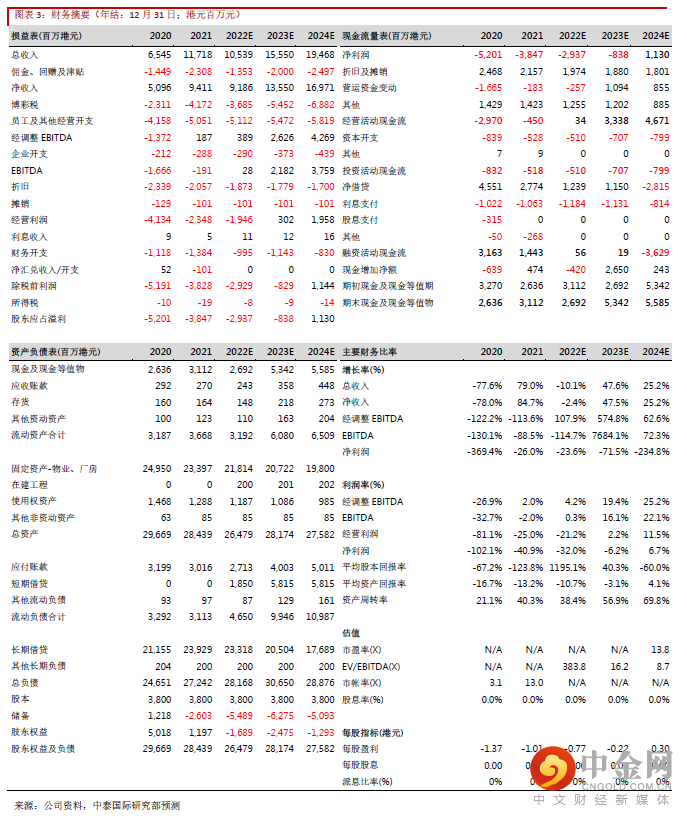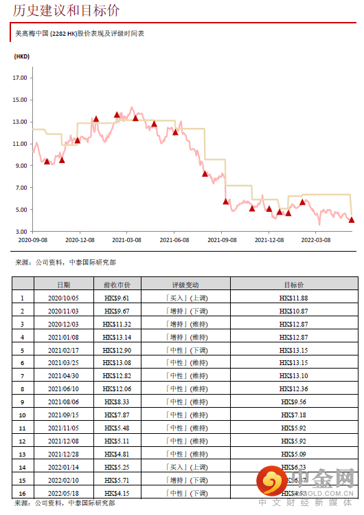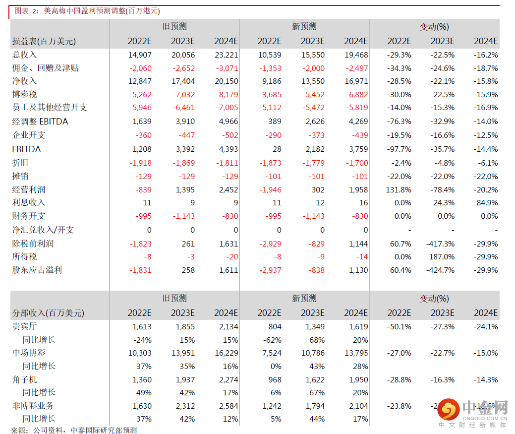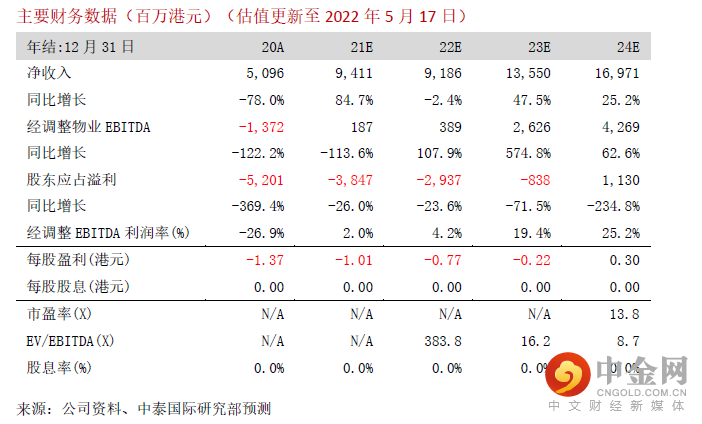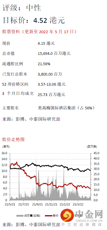 由于中央政治局会议强调对于疫情坚持外防输入、内防反弹,坚持动态清零的总方针不变,相信这些举措最终能有效控制疫情,但短期内疫情反复或导致访澳旅客量于今年难有积极的增量。我们把22-24年经调整EBITDA分别下调76.3%/32.9%/14.0%,预测22-24年经调整EBITDA分别为3.9亿/26.3亿/42.7亿港元。目标价从6.37港元下调至4.52港元,对应23年16.9倍EV/EBITDA,评级从“增持”下调至“中性”。