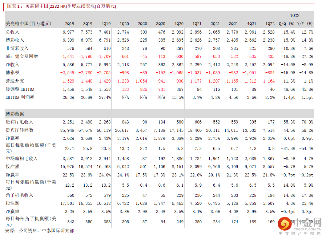 22Q1美高梅中国录得净收入20.9亿港元(下同),同比-8.9%/环比-14.6%;博彩收入为23.4亿元,环比-15.9%,差于市场平均(-6.9%),使博彩收入市占率环比下降1.4个百分点至13.0%;经调整EBITDA为0.46亿元,同比-45.8%/环比-48.6%,主因1) Q1关闭中介贵宾厅后,贵宾厅转码数环比-44.5%;2) 与博彩中介就若干诉讼拨回损失0.6亿元;3) 内地疫情反弹导致前往澳门的高端旅客大幅减少。截至22年3月底,公司拥有1.55亿美元流动资金,包括2.91亿美元的现金及1.26亿美元未动用信贷融通。基于目前的日均营运开支,预计可在零收入下支撑约26个月的营运。