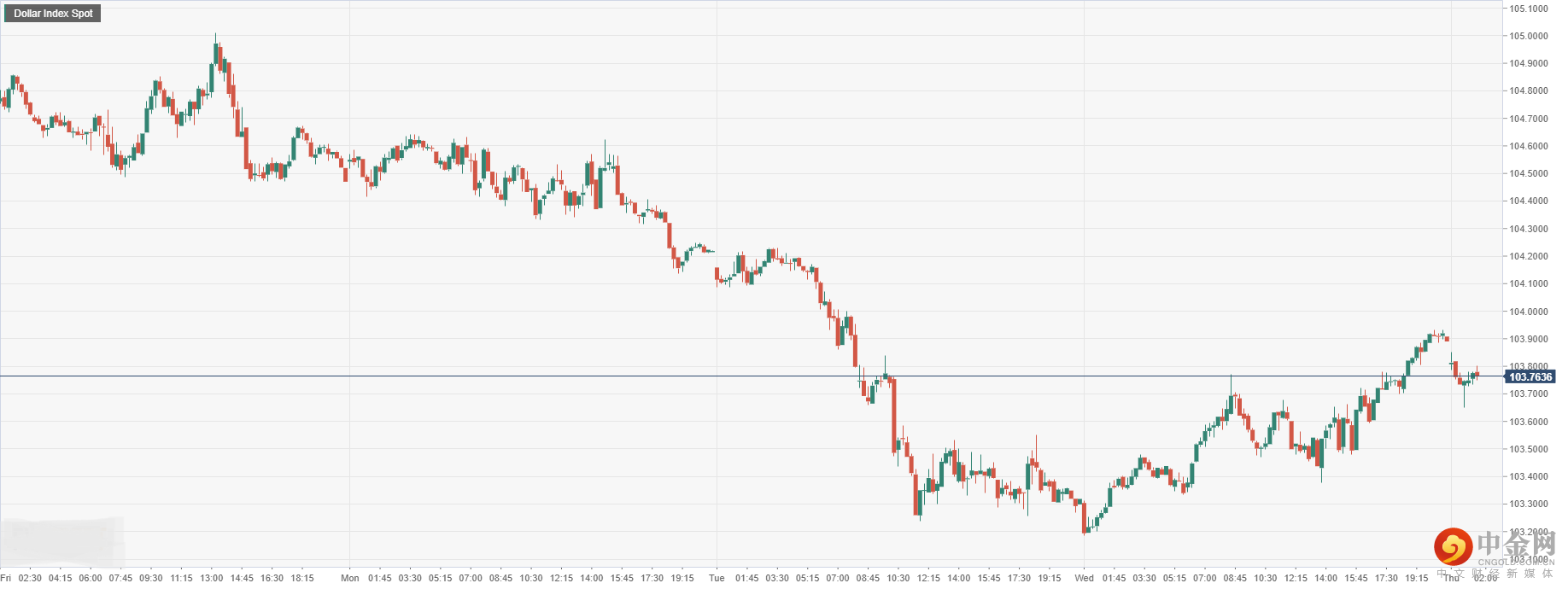美元指数周三收盘小幅回升后,今日开盘涨0.57%至103.76附近,因美联储仍寄利应对通胀采取固定鹰派政策,使得美元上行支撑。