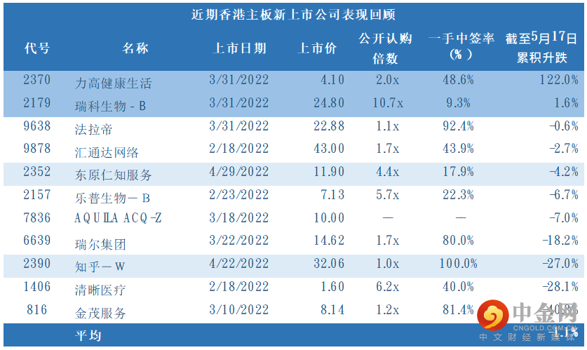 近期香港主板新上市公司表现回顾