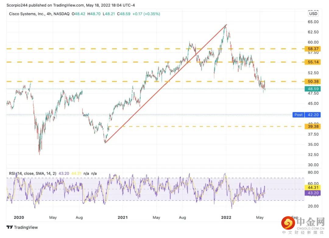 思科公司给出的糟糕的营收预期指引后,该公司的股价今晚大跌13%。鉴于我们对市场喜欢填补缺口的了解,思科公司的股价可能很快跌向40美元。