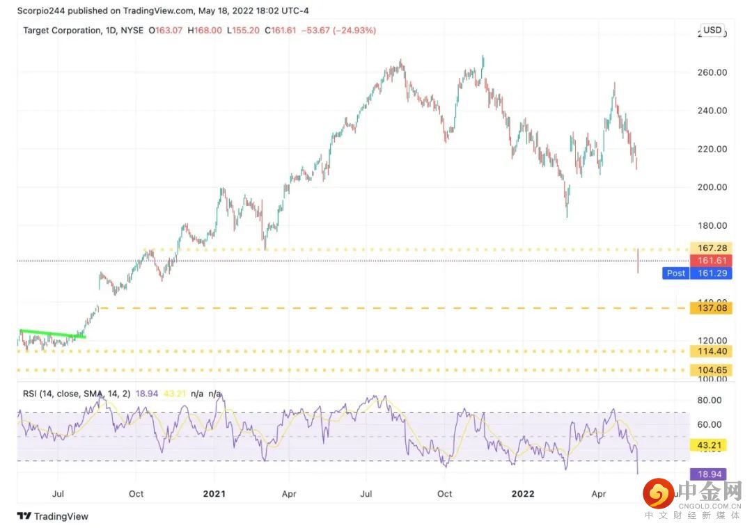 塔吉特公布了令人失望的季度业绩财报,其成本飙涨,该公司的股价暴跌。塔吉特开盘跳空跌至167美元的技术支撑线下方,并且持续下跌,收盘在161美元附近,跌幅近25%。
