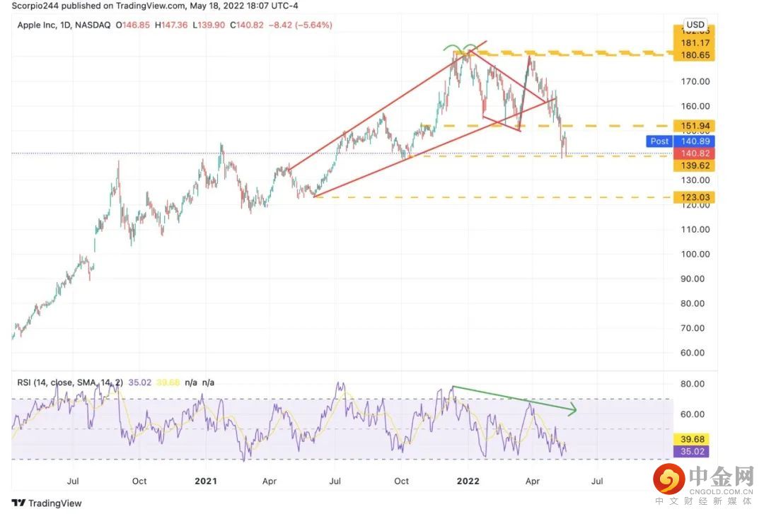 明天每个投资者均应密切关注苹果公司。如果苹果公司的股价跌破139美元的支撑线,则预示着股市的希望消失。