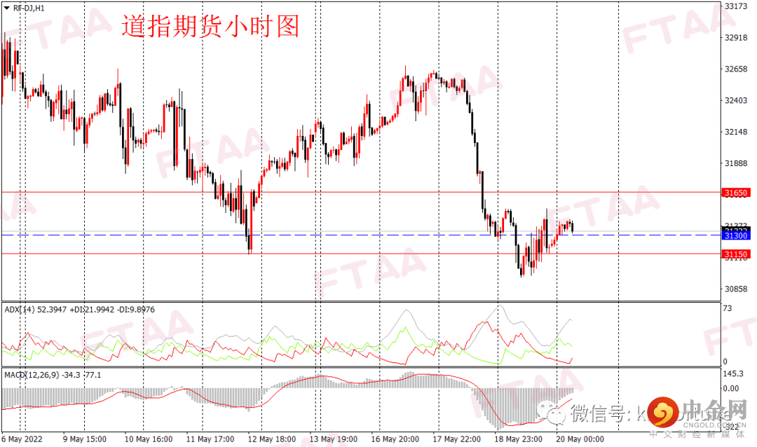 周四美股三大指数延续下跌,道指跌236点或0.75%。美国劳工部报告5月14日当周初请失业救济人数增加2.1万,升至21.8万,意外攀升至1月以来最高水平。市场延续前一日经济悲观情绪,继续抛售。道指低开震荡,午盘一度翻红,但最终回落。日图收出放量十字,显示短期多头有一定抵抗,日图级别短线或震荡。道指期货方面,昨日亚盘开盘反弹,但随后大幅下跌,美盘时段止跌回弹。当前日内或存在止跌概率。今早亚盘道指期货窄幅震荡,操作上可观望,或逢低在31300附近轻仓多,止损31150,目标31650。
