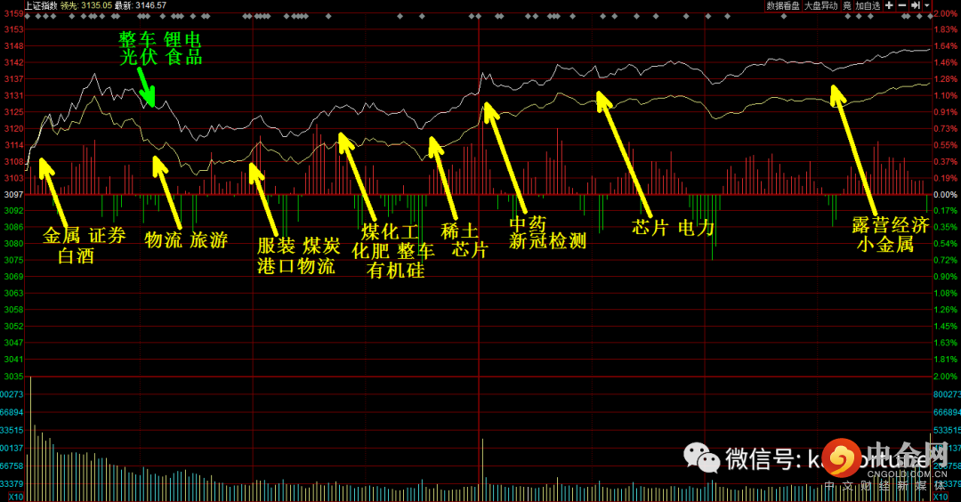 A股开盘三大指数集体高开,沪指高开0.33%,深成指高开0.55%,创指高开0.77%。金属材料、生物制品、光伏等板块高开领先,种植业、地产板块低开较多。开盘后金属资源、证券、白酒等板块轮动拉升,指数高开高走,9点45财达证券涨停,沪指涨超1%。10点物流、旅游板块拉升,但整车、锂电、光伏、食品等板块下跌,指数回落。10点半服装家纺、煤炭、港口物流等板块走强,指数重新上涨。10点50煤化工、化肥、整车板块拉升,11点15稀土、芯片板块拉升。午后开盘新冠检测、中药等板块走强,指数创出日内新高。1点半电力、芯片板块拉升。2点半露营经济、小金属板块拉升。收盘沪指涨1.60%,深成指涨1.82%,创指涨1.69%。两市超7成个股上涨,涨停个股109家,跌停个股4家。