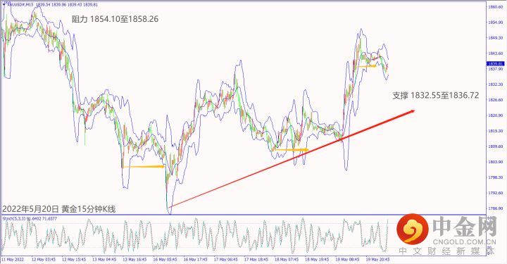 日级别线图,长阳烛收复前日跌势,守住5日均线,有望延续涨势;15分钟K线,短线形成盘涨,守稳上升趋势线,大有可能挑战前高阻力。