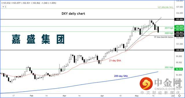 而美元可能扩大下行。美元指数如果突破102.35,可望确认低点下降,也表明无力持续守住2020年高点,从而被视为假突破反转形态,是重要的一步。短线趋势线告破,美元指数技术面或已遭遇首个重创。不过是否已筑顶,则尚需观察。