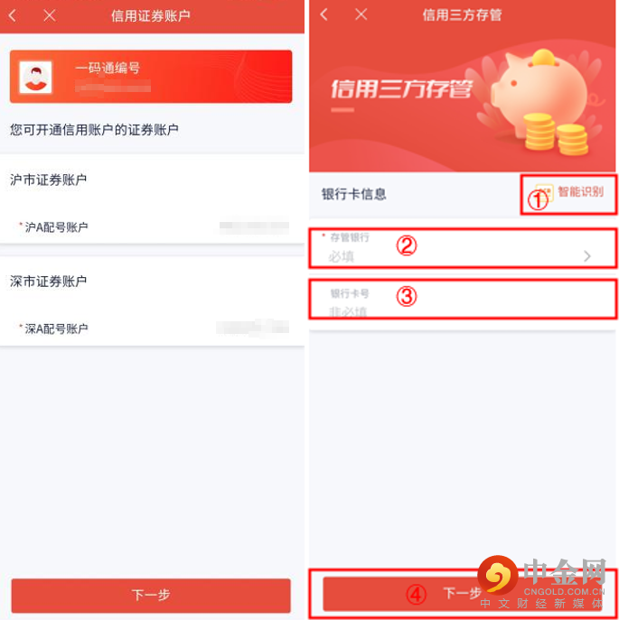 请您选择要开通的信用账户,并录入信用账户三方存管银行信息,点击右上方按钮可对银行卡进行智能识别。